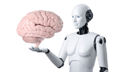 A futuristic robot holding a human brain, representing the intersection of technology and the human mind. It explores artificial intelligence, and the future of science.