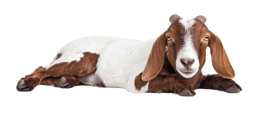 A relaxed goat resting in a tranquil setting.