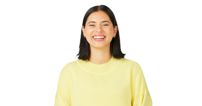Happy, laughing and portrait of a young woman isolated on a transparent, png background. Smile, positive mindset and portrait of a female person with confidence, happiness and wellness or motivation