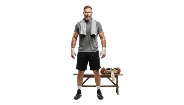 A focused athlete stands confidently on a bench, prepared for training with workout gear and a towel.