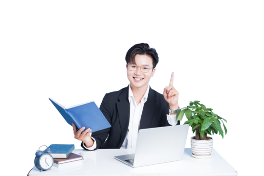 Businessman holding open book on transparent background