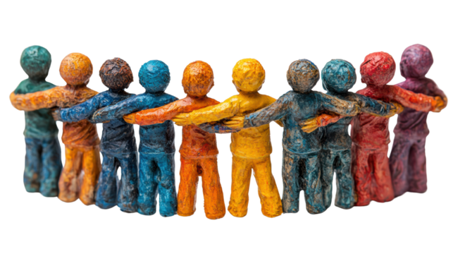 Colorful figures representing unity and diversity stand together, symbolizing harmony and friendship. Ideal for themes of community and collaboration.
