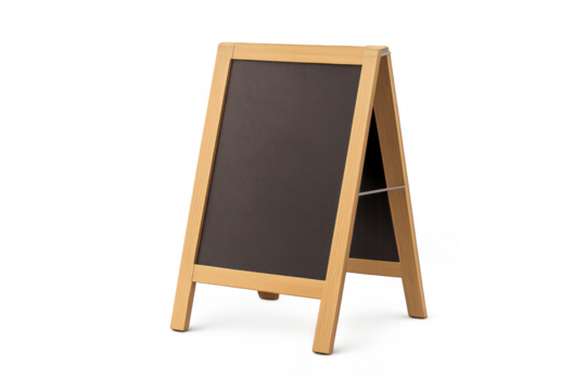 Wooden framed chalkboard isolated PNG, A-frame sandwich board with dark surface for restaurant menu or advertising on transparent background
