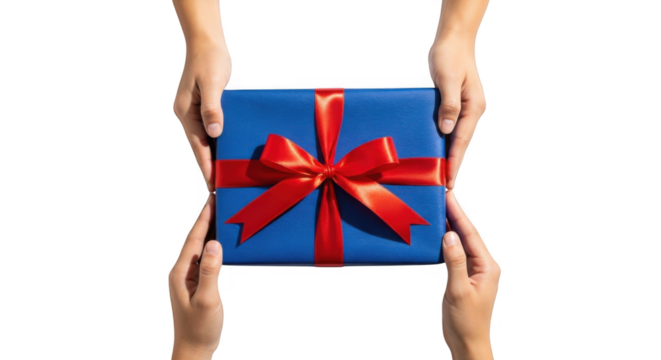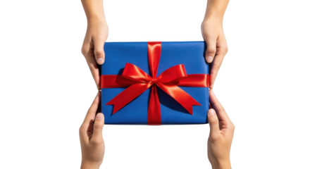 Dua Tangan Memberikan Hadiah Kotak Biru dengan Pita Merah PNG