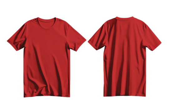 Kaos polos depan belakang berwarna merah dengan latar belakang transparan. Sebuah mockup kaos merah polos dengan latar belakang transparan.