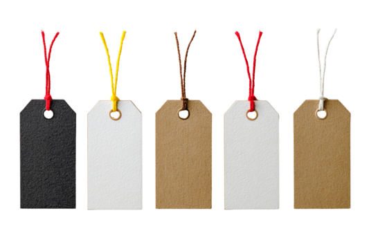 Five blank gift tags in black, white, and brown with colorful strings, isolated on transparent background