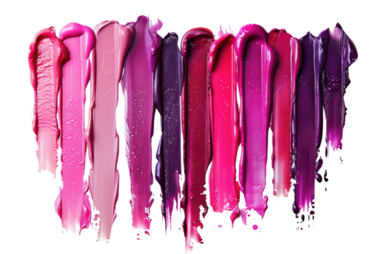 A close-up shot of a variety of lipstick colors applied in vertical stripes on a clean, moisturized lip. Realistic photos isolated on white background