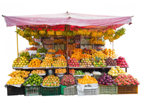 Rustic merchant stalls with awnings and goods isolated on transparent PNG image perfect for marketplace scenes or village setups