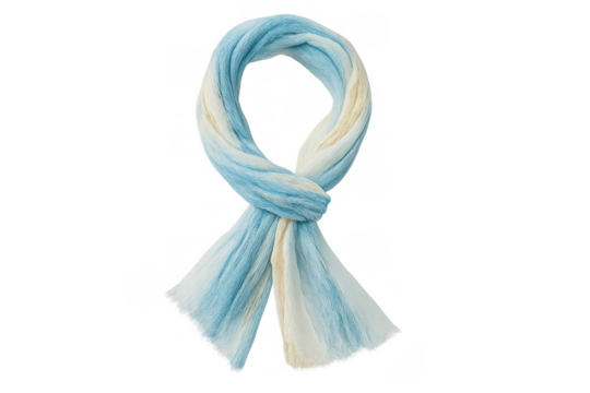 Warm winter scarf with light blue and beige stripes, knotted and isolated on transparent background, perfect for cold weather