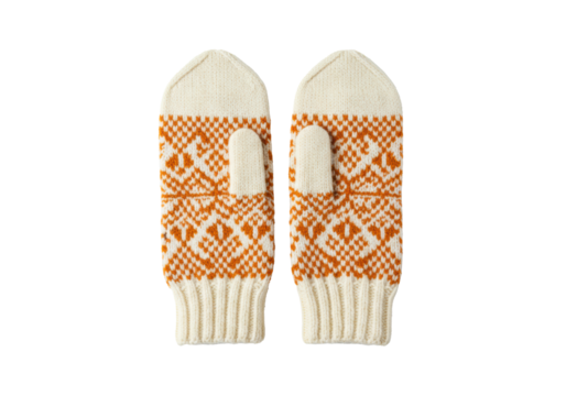Perfectly symmetrical pair of chunky, handcrafted merino wool mittens, white with burnt orange geometric jacquard pattern, isolated on a high-key background with copy space. Concept of artisan winter