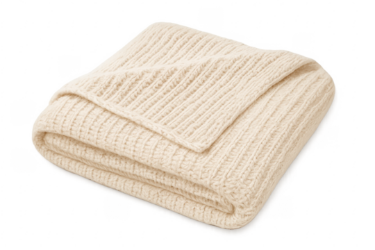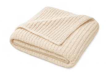 Warm, chunky, beige knitted blanket folded on transparent background, creating a cozy and inviting atmosphere