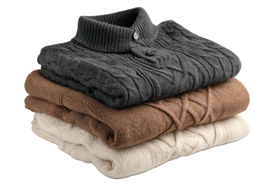 Stacked, folded knit sweaters in gray, brown, and off-white