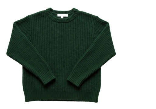 deep forest green chunky knit pullover sweater, luxurious merino wool texture, flat lay on transparent high-key background with copy space. concept of cozy premium knitwear