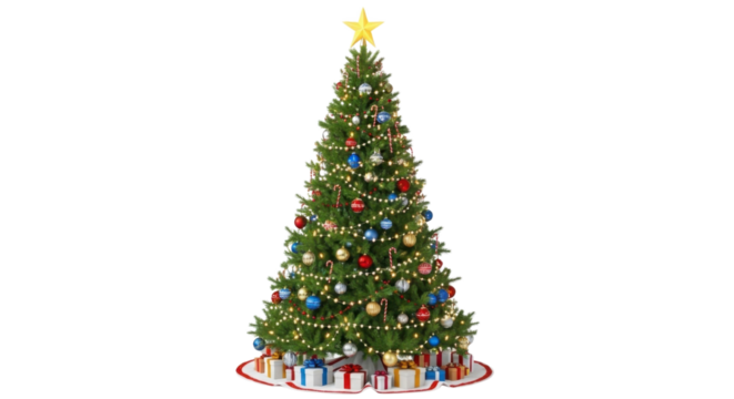 Decorated Christmas tree with colorful ornaments and gifts isolated PNG with Transparent Background