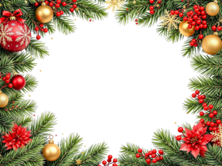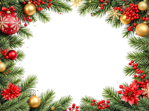 Christmas Branches Border with Christmas Decorations on Transparent Background