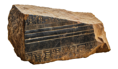 An ancient clay tablet inscribed with cuneiform script, isolated on a transparent background