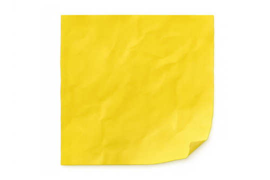 Yellow sticky note with creased paper and curled corner displaying blank space for message or reminder, transparent background
