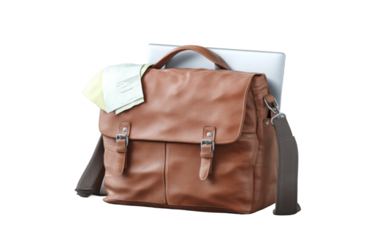 Brown leather messenger bag with paper and laptop partially exposed, cut out