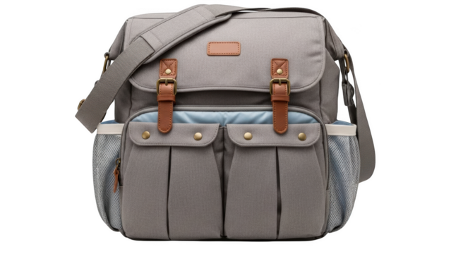 Gray messenger bag with brown leather accents and mesh side pockets grey