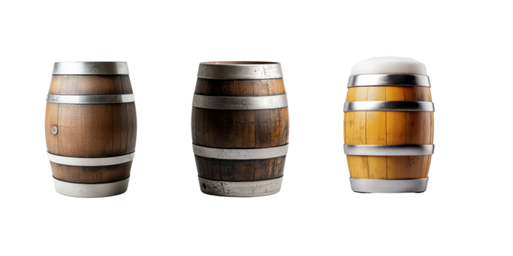 Wooden Beer Barrel Mugs:  A trio of wooden barrel mugs, reminiscent of traditional German beer steins, stand proudly against a crisp white background. These rustic yet stylish vessels, with their meta