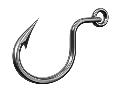 Hyper-realistic 3D render of a steel eye hook with a sharp, narrow tip, polished meta