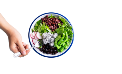 Hand with a spoon reaching into a vibrant and healthy power bowl, filled with fresh vegetables, beans, and wholesome ingredients for a nutritious meal
