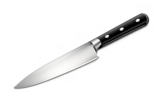 Kitchen chef knife with sharp metal blade and black handle, essential cooking utensil for professional food preparation on transparent background