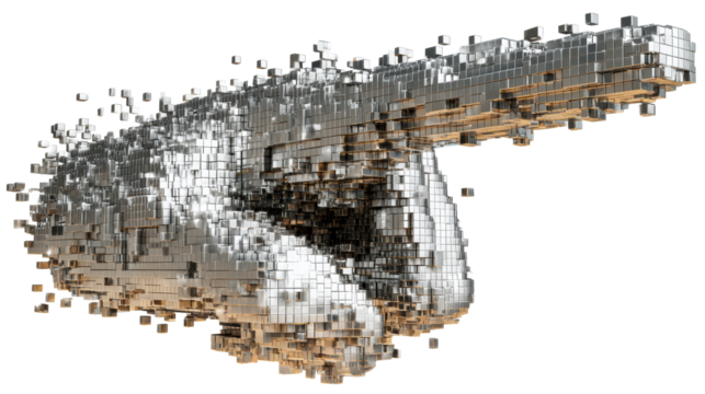 Metallic cubes disintegrate and scatter in a dynamic, abstract explosion, ideal for conveying themes of data loss, fragmentation, or digital transformation.
