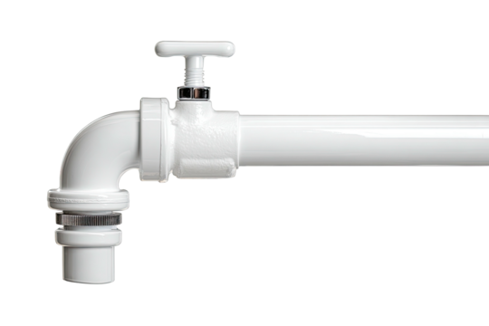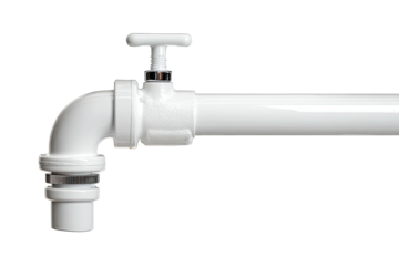 White PVC faucet with handle, attached to a glossy white pipe