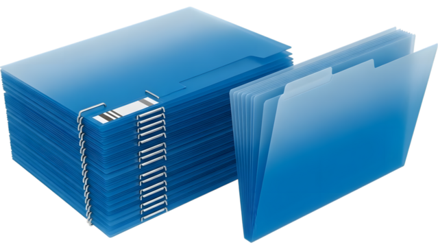 Blue file folders with metal rings isolated on a transparent background office supplies stacked files