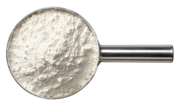 Metal measuring cup filled with white flour