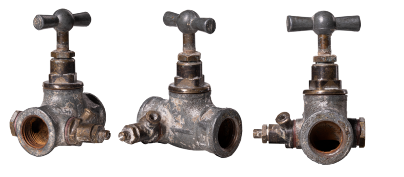 Old, metal ball valve with a yellow lever, isolated. The valve is worn and rusted.