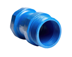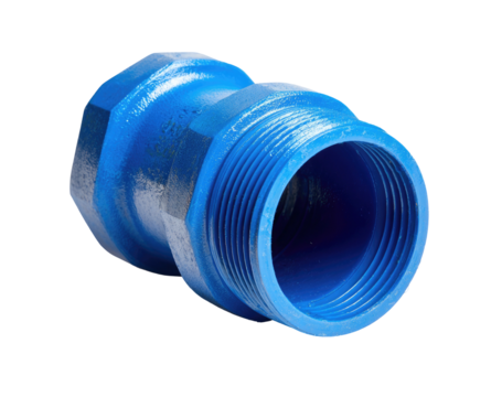 Blue metal pipe fitting, threaded, tapered, centered on a black background