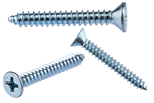 Isolated screw lies horizontally, showing head, threads, tapered tip, metal fastener object