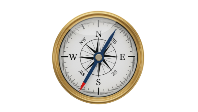 A gleaming brass compass rose with eight points symbolizes direction and exploration.