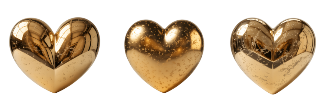 Set of glossy metallic hearts in varied styles and sizes, 3D render style, isolated on transparent background PNG. Perfect for Valentine, wedding, cards, and social media.