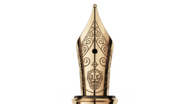 Gold fountain pen nib with intricate and lion engraving isolated on a transparent background