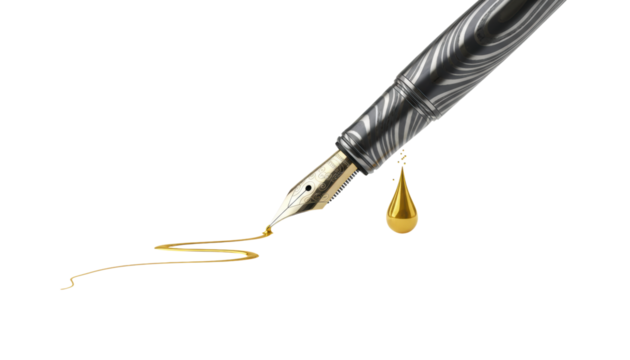 Luxurious fountain pen with an ornate gold nib and patterned barrel writes an elegant signature with liquid gold ink, with a single golden drop falling from the tip