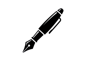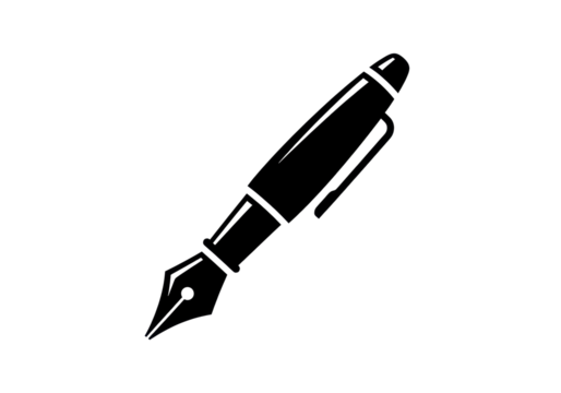 stylized solid black fountain pen icon, minimalist flat design, detailed metallic nib silhouette, dynamically angled, isolated on a transparent background with copy space. concept of sleek graphic