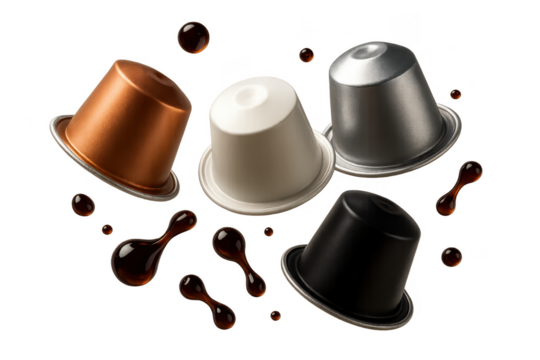 Coffee capsules with coffee drops on transparent background, isolated objects