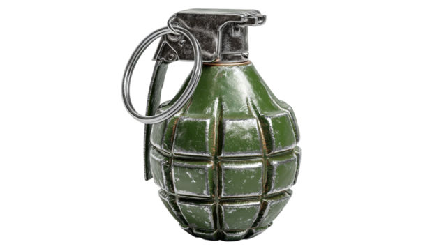 PNG of A metallic green hand grenade captured from a side angle, showcasing intricate details and textures.