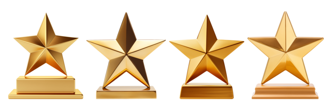 Four shiny gold star awards isolated on a transparent background