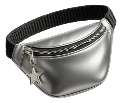 Shiny silver belt bag featuring a star zipper pull and an elastic waistband.