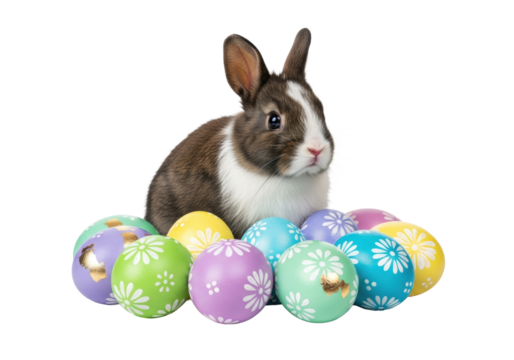 a fluffy baby bunny with espresso brown and white fur, sitting calmly within a cluster of glossy pastel easter eggs decorated with gold accents, macro close-up on a white studio background. concept