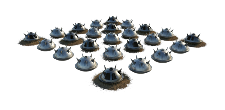 Many metallic spiked dome objects are arranged in a grid pattern on patches of dry grass, creating a sense of danger or a futuristic defense system.