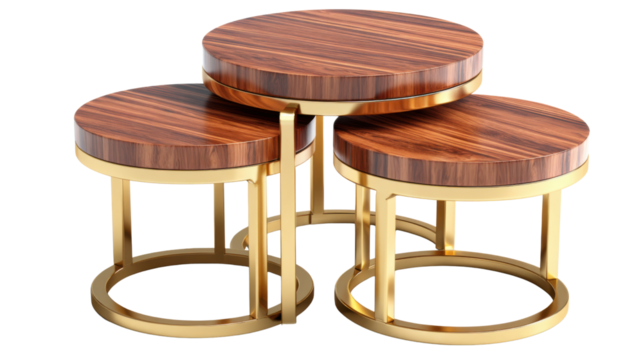 Modern Coffee Table Ensemble: A sophisticated trio of stylish coffee tables showcases a minimalist design. The warm wood tops are elegantly contrasted with sleek metallic legs.