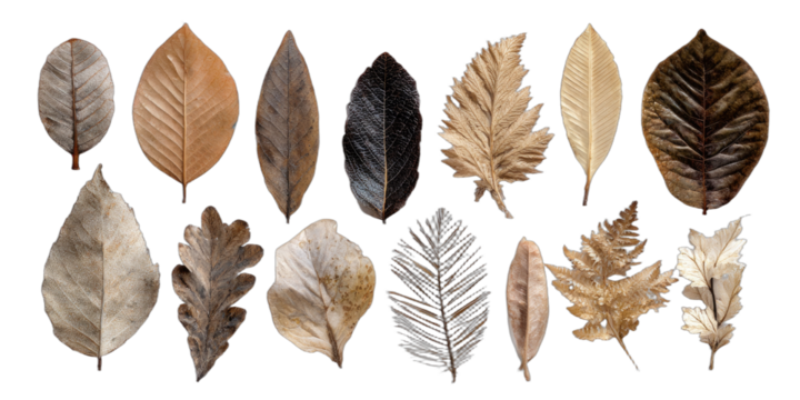 Collection of diverse dry leaves in natural earthy and metallic tones on black background