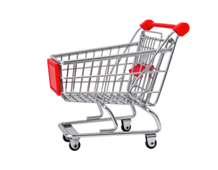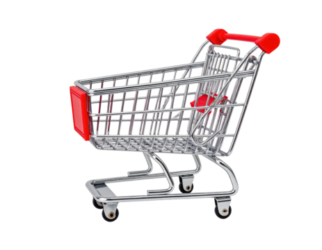 A clean, empty metallic silver shopping cart with black wheels and red accents, studio shot on a transparent background, ample copy space, concept for e-commerce and digital opportunity