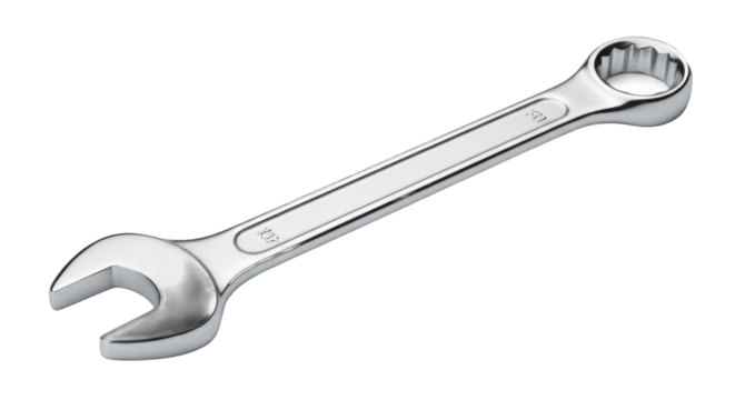 A close-up image of a metallic combination wrench isolated on a transparent background, showcasing its open-end and box-end design for mechanical use.