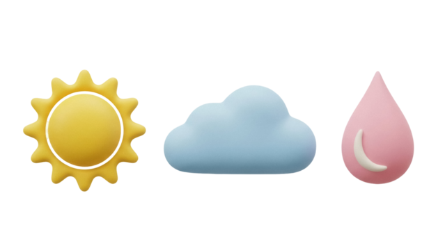 Isolated Weather Icons, Yellow Sun, Blue Cloud, and Pink Rain Drop, Forecast Elements